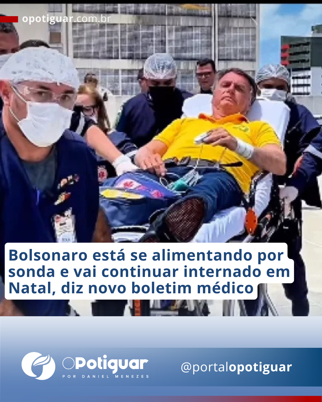Do G1 - O ex-presidente Jair Bolsonaro está se alimentando por sonda e vai continuar internado em Natal, de acordo com o novo boletim do Hospital Rio Grande, divulgado às 17h desta sexta-feira (11). A equipe médica informou que não há previsão de alta.