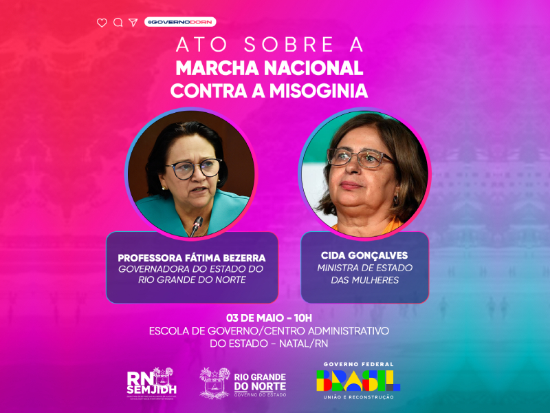 Autor: RedaçãoNa próxima quarta-feira, (3), às 10h, o Governo do RN, vai sediar o Ato sobre a Marcha Nacional contra a Misoginia. O evento será promovido pelo Ministério das Mulheres, em parceria com o Governo do Estado, através da Secretaria de Estado das Mulheres, da Juventude, da Igualdade Racial e dos Direitos Humanos (SEMJIDH). Estarão presentes no ato a Ministra das Mulheres, Cida Gonçalves, a Governadora do Estado, Fátima Bezerra e a Secretária da SEMJIDH, Olga Aguiar.