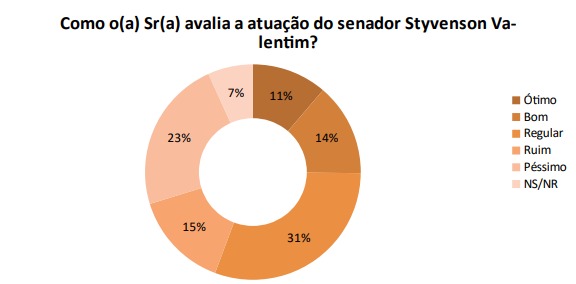 A atuação dos senadores do RN também foi avaliada. De acordo com a pesquisa, 11,3% consideram ótima a atuação do senador Styvenson Valentim (Podemos), 13,9% avaliam com bom, 30,5% consideram regular, 14,5% acham ruim e 23% péssimo.
