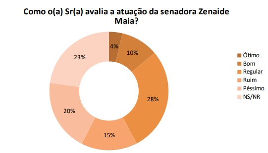 Já 3,6% consideram ótima a atuação da senadora Zenaide Maia (PSD), 10,3% avaliam como bom, 28,4% regular, 15,3% ruim e 19,6% péssimo.