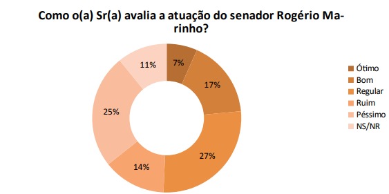 O senador Rogério Marinho (PSDB) obteve 6,6% como uma atuação ótima, 16,9% bom, 27,2% regular, 13,6% ruim e 24,8% péssimo.