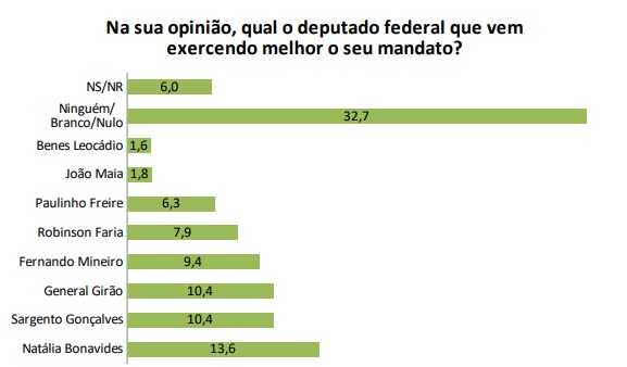 Já a pesquisa de deputado federal, Natália Bonavides (PT) obteve 13,6%, Sargento Gonçalves e General Girão, ambos com 10,4% e Fernando Mineiro com 9,4%.