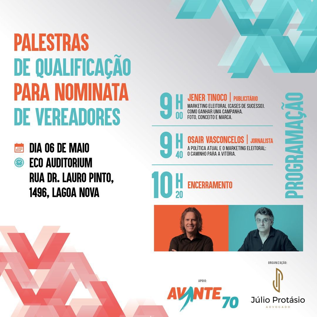 O partido Avante RN realiza, neste sábado, 06, ciclo de palestras de qualificação para pré-candidatos a vereadores para o pleito 2024. O evento acontecerá no Eco Auditorium, na rua Dr. Lauro Pinto, 1496, Lagoa Nova, e contará com a palestra do publicitário Jener Tinoco, sobre "Marketing Eleitoral (cases de sucesso). Como ganhar uma campanha: foto, conceito e marca", e a palestra do jornalista Osair Vasconcelos, com o tema "A política Atual e o Marketing Eleitoral: o caminho para a vitória".