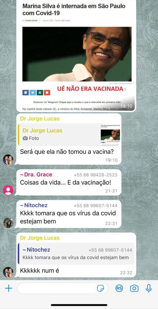 O portal local Contilnet divulgou conversa do grupo de WhatsApp “Médicos Unidos” em que os profissionais riem da situação da ministra, questionam a eficácia da vacina e desejam “que os vírus da covid estejam bem”. Marina tomou 4 doses da vacina contra a covid.