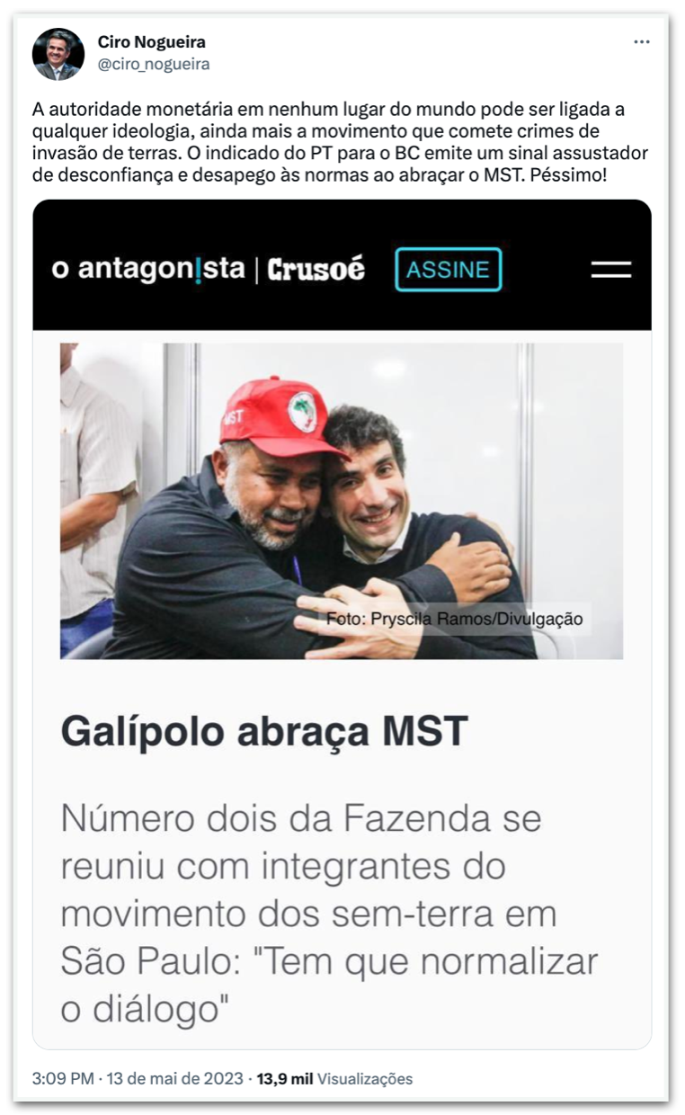 O senador e ex-ministro da Casa Civil Ciro Nogueira (Progressistas-PI) criticou a visita a uma feira do MST (Movimento dos Trabalhadores Sem Terra) por Gabriel Galípolo, indicado pelo presidente Luiz Inácio Lula da Silva (PT) para a diretoria de política monetária do Banco Central. “Autoridade monetária em nenhum lugar do mundo pode ser ligada a qualquer ideologia, ainda mais a movimento que comete crimes de invasão de terras”, disse Nogueira neste sábado (13.mai.2023) em seu perfil do Twitter. Infelizmente o político continua sendo apenas um lacrador de péssima qualidade.