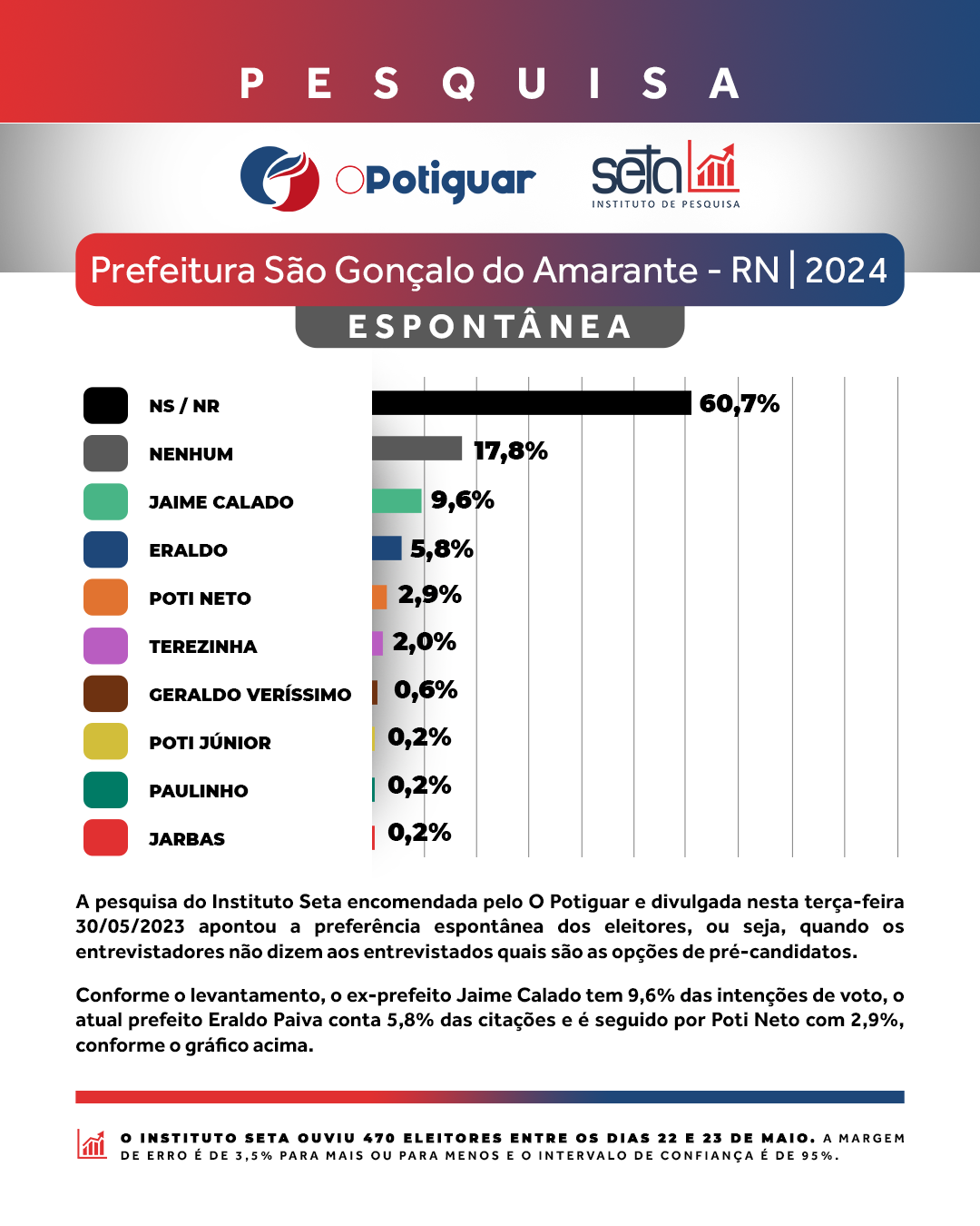 A pesquisa do Instituto Seta encomendada pelo O Potiguar e divulgada nesta terça-feira 30 apontou a preferência espontânea dos eleitores, ou seja, quando os entrevistadores não dizem aos entrevistados quais são as opções de pré-candidatos.