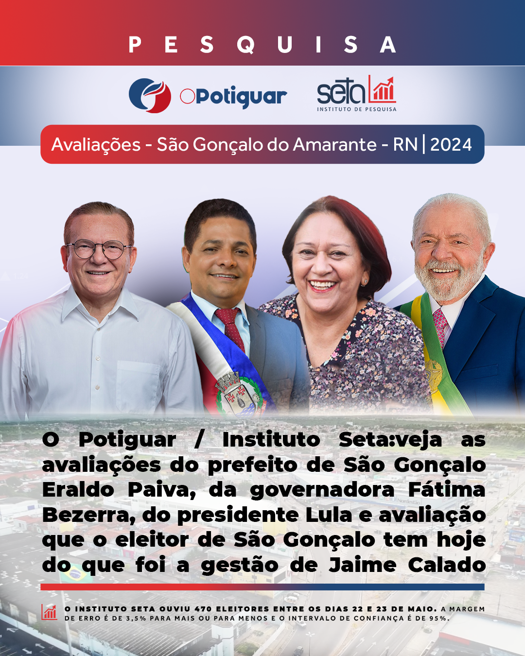 O POTIGUAR / Instituto Seta: veja as avaliações do prefeito de São Gonçalo Eraldo Paiva, da governadora Fátima Bezerra, do presidente Lula e avaliação que o eleitor de São Gonçalo tem hoje do que foi a gestão de Jaime Calado