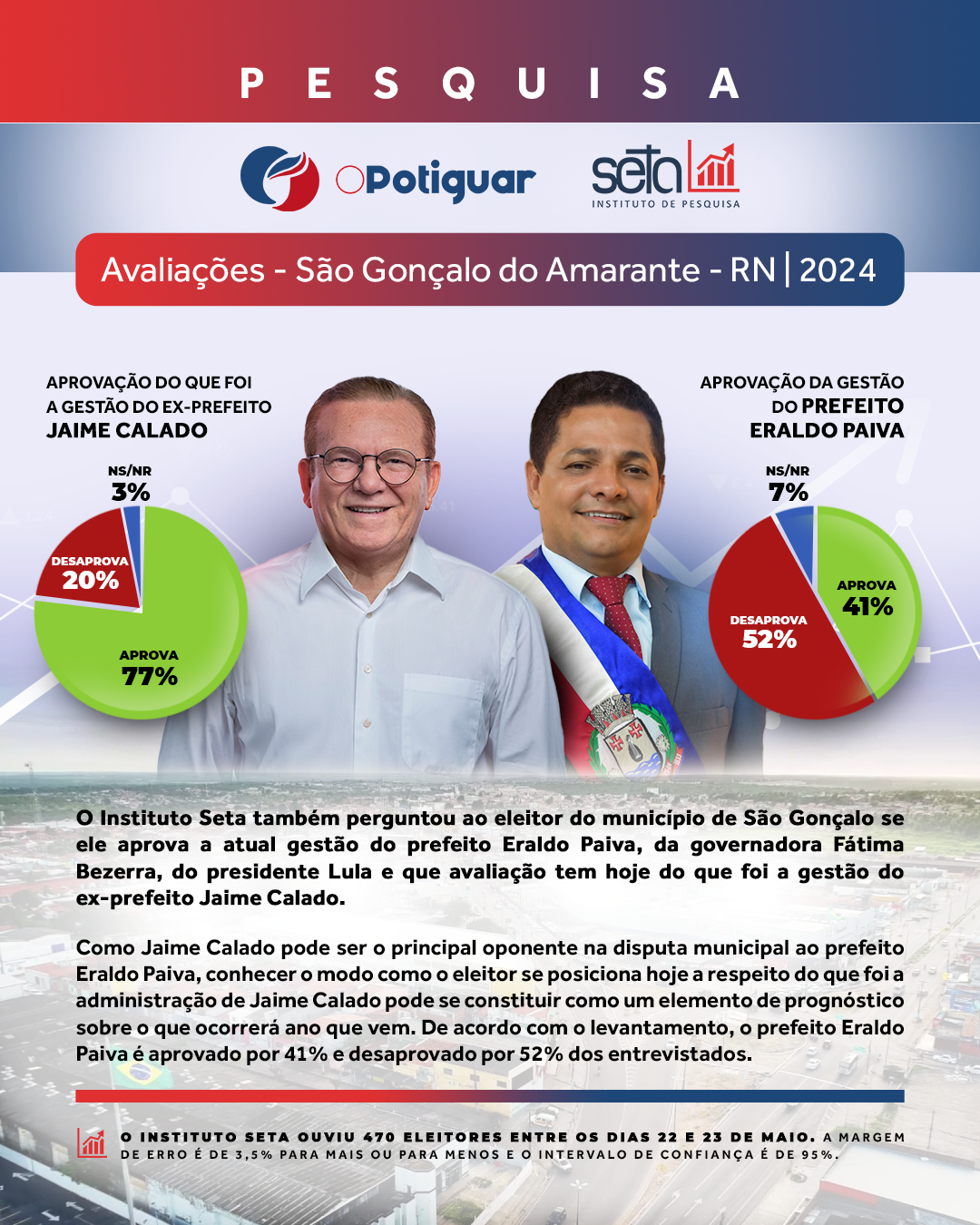 O Instituto Seta também perguntou ao eleitor do município de São Gonçalo se ele aprova a atual gestão do prefeito Eraldo Paiva, da governadora Fátima Bezerra, do presidente Lula e que avaliação tem hoje do que foi a gestão do ex-prefeito Jaime Calado.