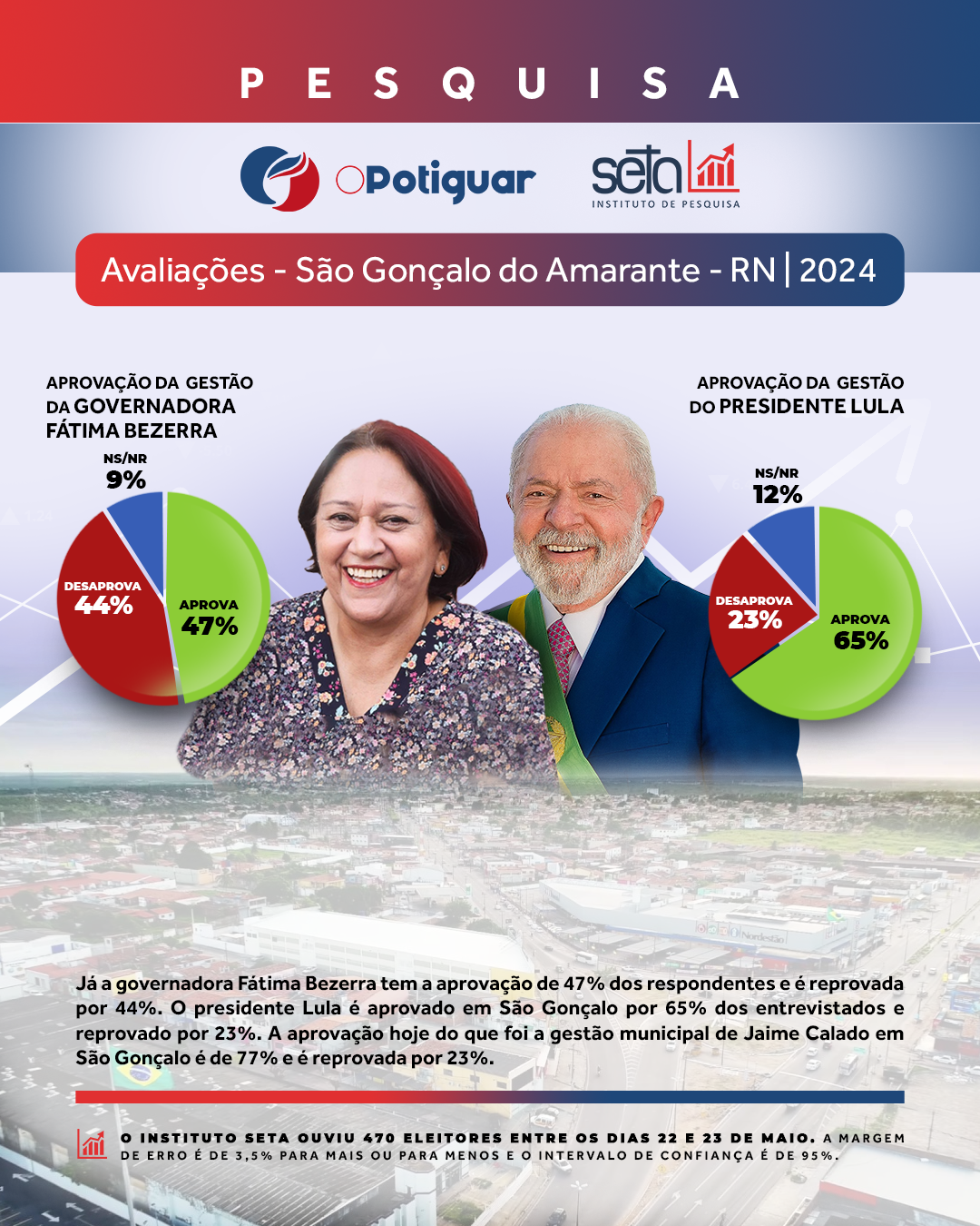De acordo com o levantamento, o prefeito Eraldo Paiva é aprovado por 41% e desaprovado por 52% dos entrevistados. Já a governadora Fátima Bezerra tem a aprovação de 47% dos respondentes e é reprovada por 44%.
