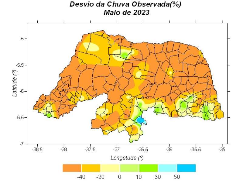 Pela climatologia, que utiliza um banco de dados com mais de 30 anos de registros acumulados, maio de 2023 foi um mês muito seco. “Além de índices baixos, as distribuições temporais e espaciais bastante irregulares, podem ter prejudicado o desenvolvimento da agricultura em algumas regiões do Estado, principalmente no Agreste”, explicou o chefe da unidade instrumental de Meteorologia, Gilmar Bristot.