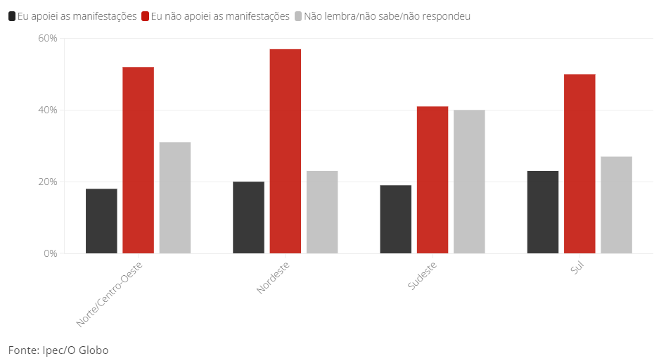 No Nordeste, por exemplo, apenas 23% afirmam que não se lembram do movimento ou não responderam -- índice mais baixo do país. Por outro lado, 57% dos nordestinos afirmam que não apoiaram os protestos realizados há dez anos.