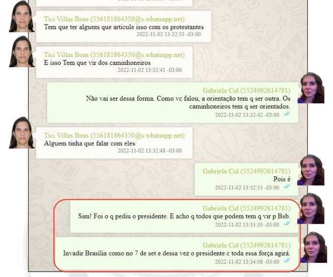 Na conversa, Tici Villas Boas clama pela intervenção dos caminhoneiros e a esposa de Cid diz que o presidente Jair Bolsonaro orientou a categoria em prol de atuação golpista.