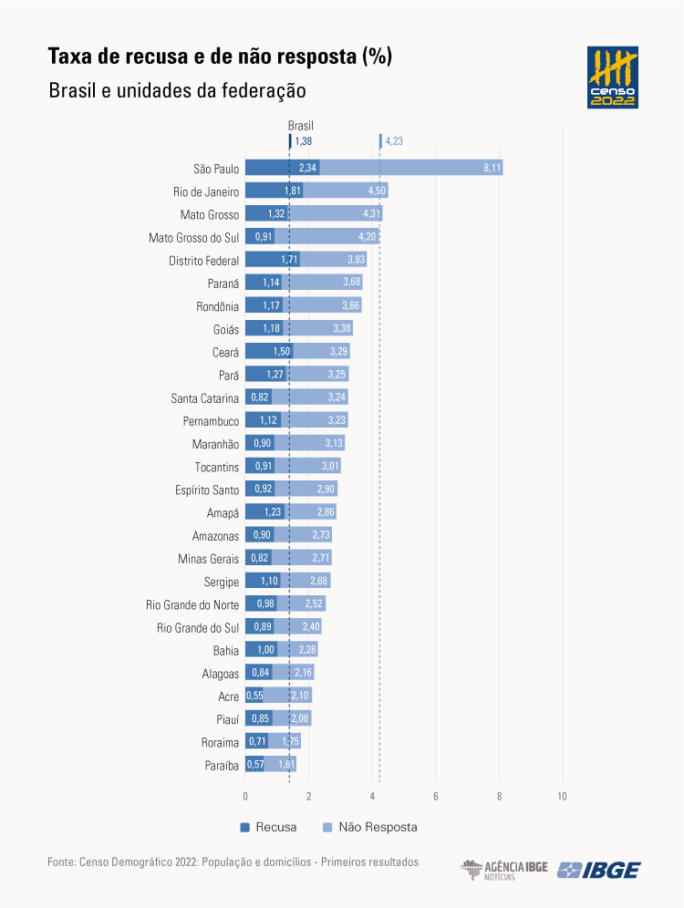 A taxa de resposta do Censo 2022, ou seja, o percentual de domicílios em que houve entrevista, foi de 95,8%. O Nordeste registrou menor percentual de domicílios em que a entrevista não foi realizada (2,7%), enquanto no Sudeste ocorreu o maior (5,9%). Em grande parte das unidades da Federação (24 das 27), esse percentual ficou abaixo da média do país (4,2%) e entre elas se destacam Paraíba (1,61%), Roraima (1,75%) e Piauí (2,08%). Já os que ficaram acima foram Rio de Janeiro (4,50%), Mato Grosso (4,31%) e São Paulo (8,11%).