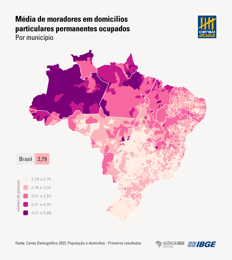Como ressaltado pelo pesquisador, a mudança provocou também a queda na média de moradores por domicílio no país, que passou de 3,31, em 2010, para 2,79, em 2022. Ainda que todos os estados tenham registrado queda nessa média, os com maior número de moradores por domicílio continuam sendo Amazonas (passando de 4,36, em 2010, para 3,64, em 2022) e Amapá (de 4,26 para 3,63). Já os estados com as menores médias são Rio Grande do Sul (2,54), Rio de Janeiro (2,60) e Espírito Santo (2,67).