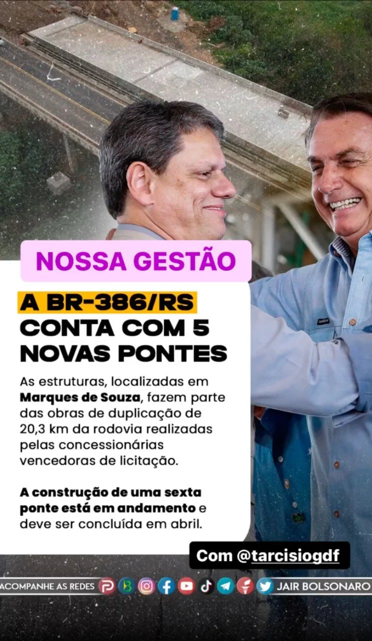 Autor: Cecília MarinhoO ex-presidente Jair Bolsonaro (PL) publicou nas redes sociais uma foto com o governador de São Paulo, Tarcísio de Freitas (Republicanos), em que fala sobre obras na BR-383, no Rio Grande do Sul, realizadas em sua gestão e quando Tarcísio era ministro da Infraestrutura. A postagem se dá depois de o chefe do Executivo paulista afirmar que sempre será “leal” a Bolsonaro. O governador disse também não ser possível “concordar em tudo”, em referência aos atritos entre os 2 sobre apoiar ou não a reforma tributária. É a 1ª manifestação do ex-presidente desde o desentendimento.