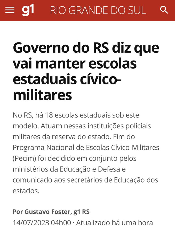 Eduardo Leite publicou em seu perfil no Twitter um print da reportagem do g1 e disse que o governo do Rio Grande do Sul iria manter as escolas cívico-militares. Atualmente, há 18 instituições estaduais nesse modelo.