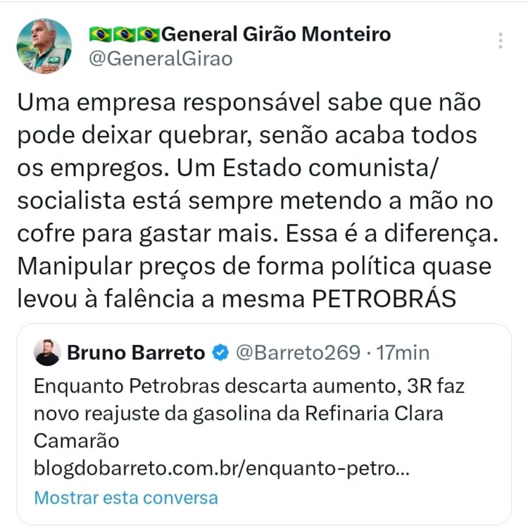 “Uma empresa responsável sabe que não pode deixar quebrar, senão acaba todos os empregos. Um Estado comunista/socialista está sempre metendo a mão no cofre para gastar mais. Essa é a diferença. Manipular preços de forma política quase levou à falência a mesma PETROBRÁS”, frisou.