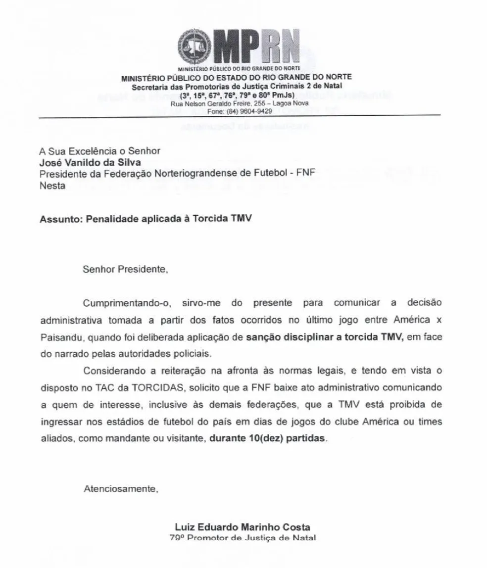 Em documento assinado pelo promotor de justiça Luiz Eduardo Marinho, o MPRN solicitou que a FNF baixasse ato administrativo comunicando que "a TMV está proibida de ingressar nos estádios de futebol do país em dias de jogos do clube América ou times aliados, como mandante ou visitante, durante 10 partidas".
