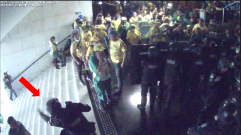 As imagens das câmeras de segurança mostram que manifestantes seguiram a equipe de tropa de choque pelo Salão Branco da Câmara avaliando qual comportamento seria adotado pelos policiais militares, que nada fizeram. Os invasores chegam a se ajoelhar diante dos policiais.