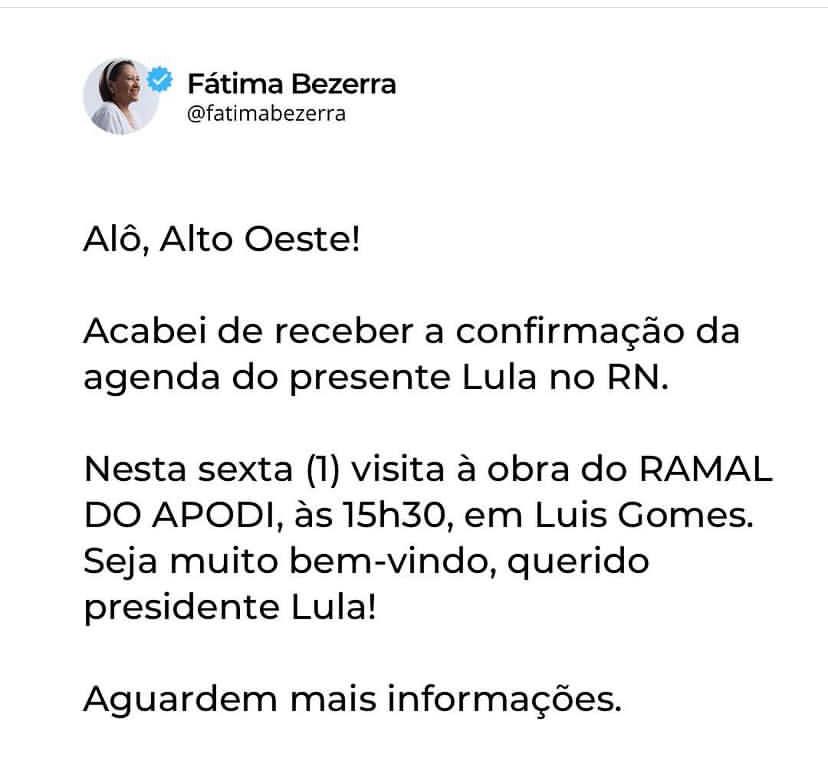 Por meio do seu Twitter, a governadora divulgou que o presidente vai visitar à obra do Ramal do Apodi, em Luis Gomes, alto oeste do estado.