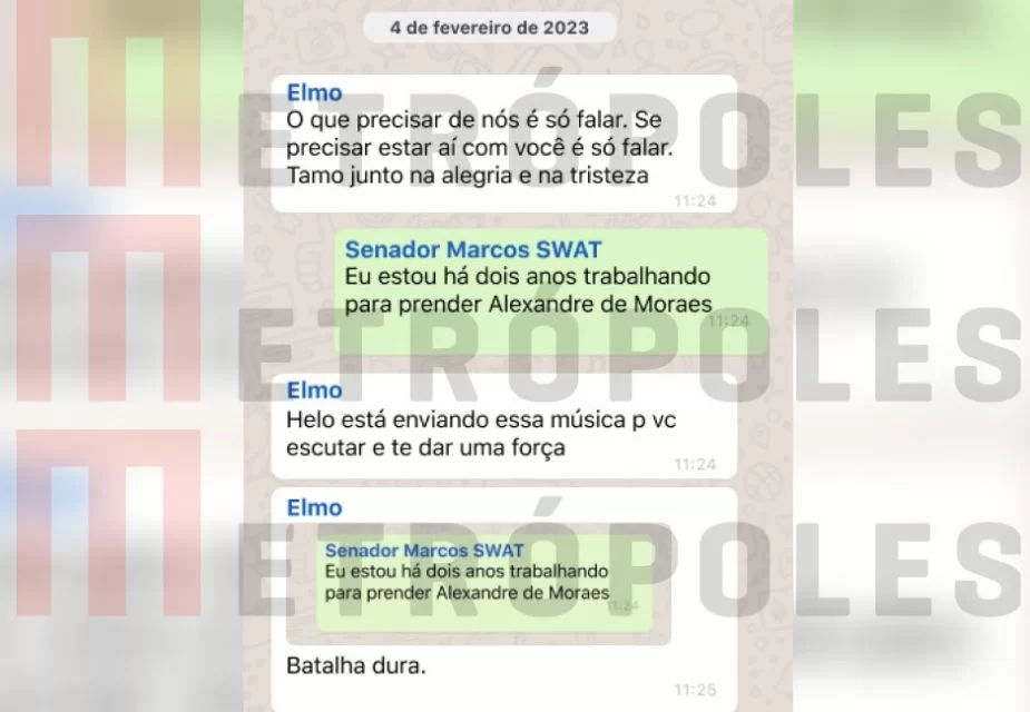 Do Metrópoles - A Polícia Federal (PF) interceptou mensagens em que um senador da República diz ter atuado para prender o ministro Alexandre de Moraes, do Supremo Tribunal Federal (STF). Obtido pela coluna, o diálogo de WhatsApp foi encontrado no celular de Marcos do Val e remete a fevereiro deste ano.