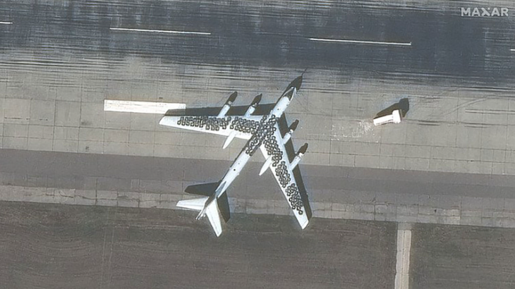 Imagens de satélite da Base Aérea Maxar de Engels, no interior da Rússia, mostram dois bombardeiros estratégicos Tu-95 com pneus de carro no topo da fuselagem.