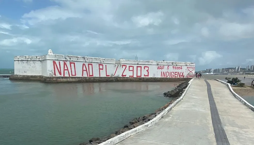 Esta semana o Forte dos Reis Magos amanheceu pichado com frase de protesto contra o projeto que estabelece marco temporal contra demarcação de terras indígenas.