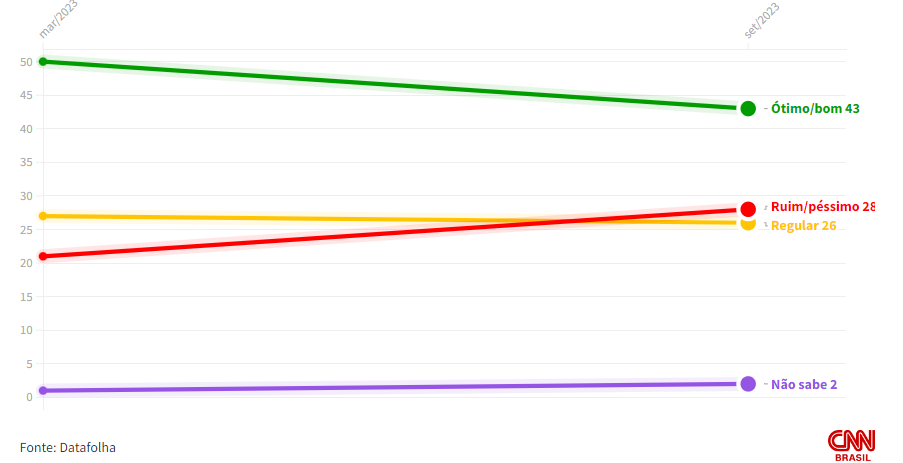 Sobre o futuro do governo, 43% acham que ele será ótimo ou bom nos próximos anos. Para 26%, a administração será regular, e 28% consideram que ela será ruim ou péssima. Não sabem são 2%.