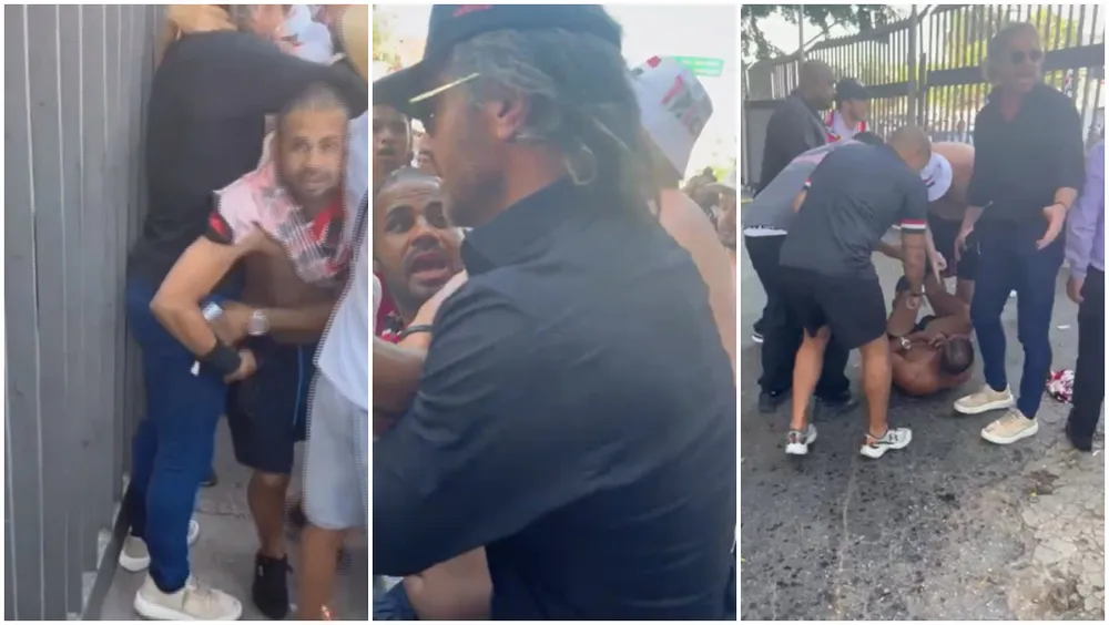 Lugano segura o rapaz e pede para chamarem a polícia. Em seguida, é possível ver pelo vídeo que o suspeito de furto é agredido por torcedores e cai no chão.