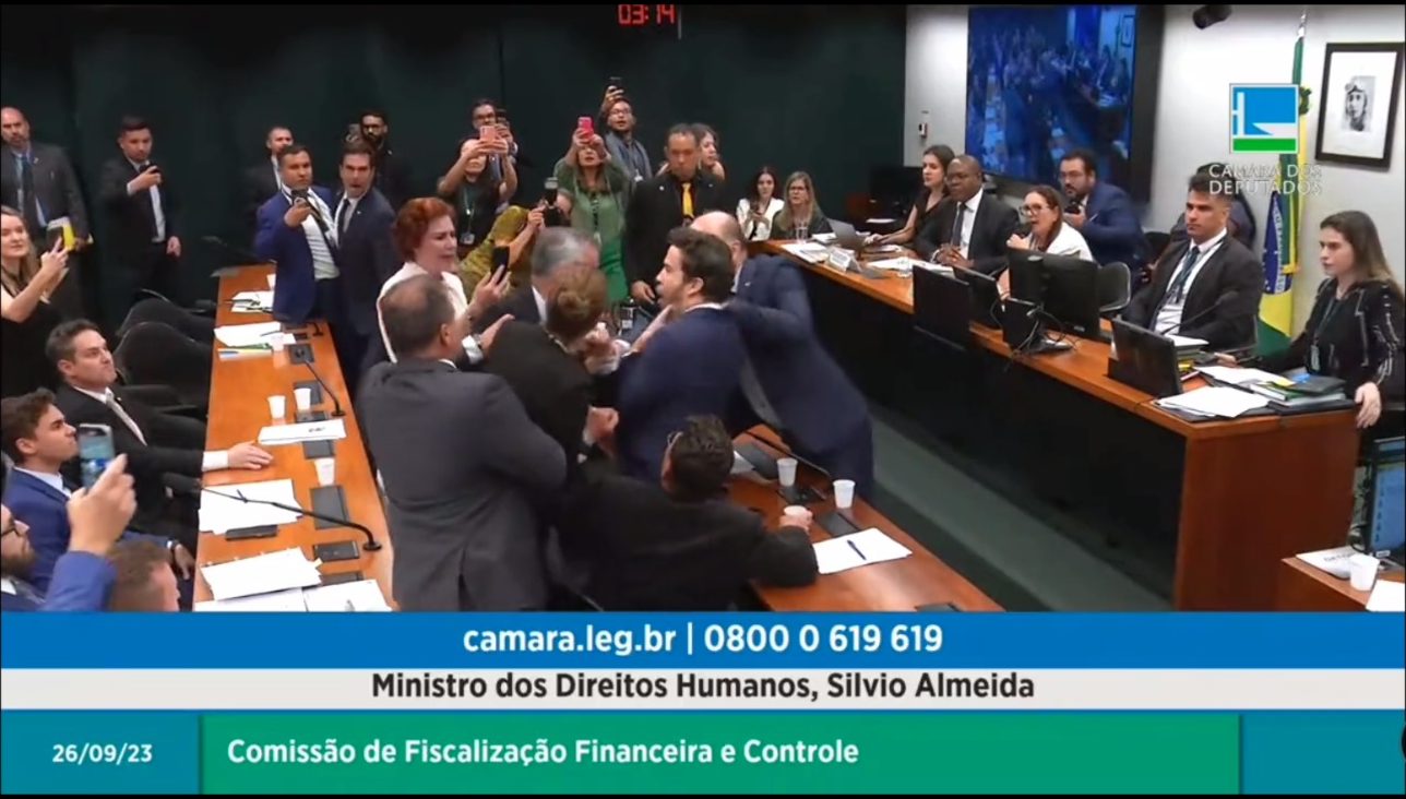 A briga ocorreu durante a participação do ministro dos Direitos Humanos, Silvio Almeida, que relatou ter sido chamado de “covarde” por parlamentares. Janones interveio e começou a discutir com os bolsonaristas que ofenderam o convidado.