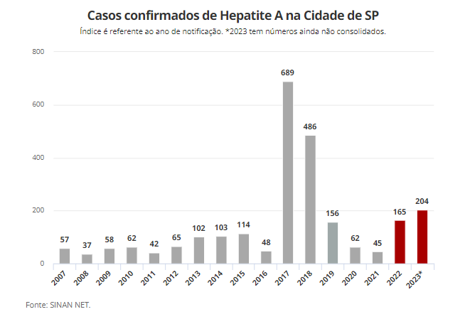 Desde o ano passado, a cidade de São Paulo tem enfrentado um aumento de casos confirmados de hepatite A, doença que causa uma inflamação do fígado. Em 2022, foram registrados 165 casos, e até o momento em 2023, já são 204 ocorrências.