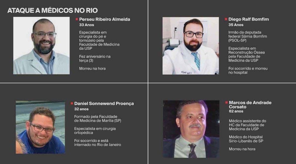 A quarta vítima dos disparos, o médico Daniel Sonnewend Proença, de 32 anos, está internado, em um hospital na Zona Oeste do Rio. Seu estado é considerado estável. O g1 apurou que ele foi atingido por 14 disparos, sendo 2 de raspão.