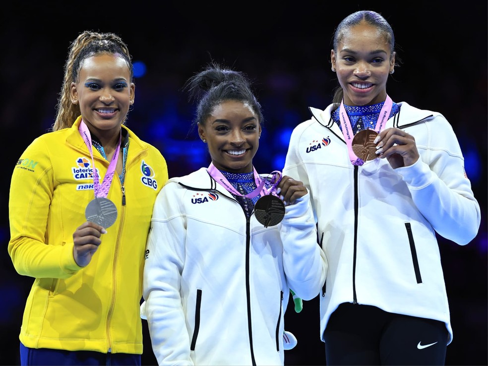 Simone Biles e Rebeca Andrade ficaram lado a lado para receber suas medalhas. Pela primeira vez as duas estrelas da ginástica artística dividiram um pódio em uma prova individual. Nesta sexta-feira, a americana retomou o posto de número 1 do mundo e conquistou o hexa do individual geral no Mundial da Antuérpia. Campeã no ano passado, a brasileira também brilhou com a prata. A americana Shilese Jones completou o primeiro pódio 100% de mulheres pretas da prova mais nobre de um Mundial. Flávia Saraiva acabou na 15ª posição depois de ter sofrido duas quedas.