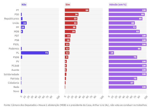 Apenas 2 dos 38 parlamentares da bancada foram contra o texto, taxa de 95% de apoio. O MDB ficou com 82%: foram 28 votos favoráveis, 5 contra e o único caso de abstenção na votação da proposta.