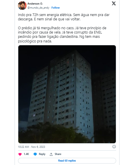 "Quando a vizinhança toda estava com luz e a gente não, logo sacamos que o problema não estava em uma árvore que caiu por perto. A própria administradora informou que poderia ser um problema da rede do prédio, que é diferente das outras torres. Mas no meio de tanta ocorrência na cidade, nosso problema deve ter se perdido na Enel, ou não tratado como prioridade. Os dias foram passando, a luz não voltava", disse o publicitário.