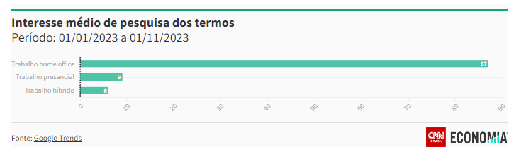 O interesse por trabalho home office se releva superior aos outros regimes de trabalho no decorrer deste ano, segundo dados do Google Trends.