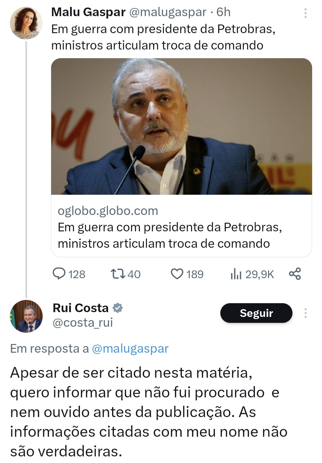 A jornalista Malu Gaspar do Jornal O Globo alegou que o chefe da casa civil Rui Costa está tentando retirar Jean Paul Prates da presidência da petrobras.