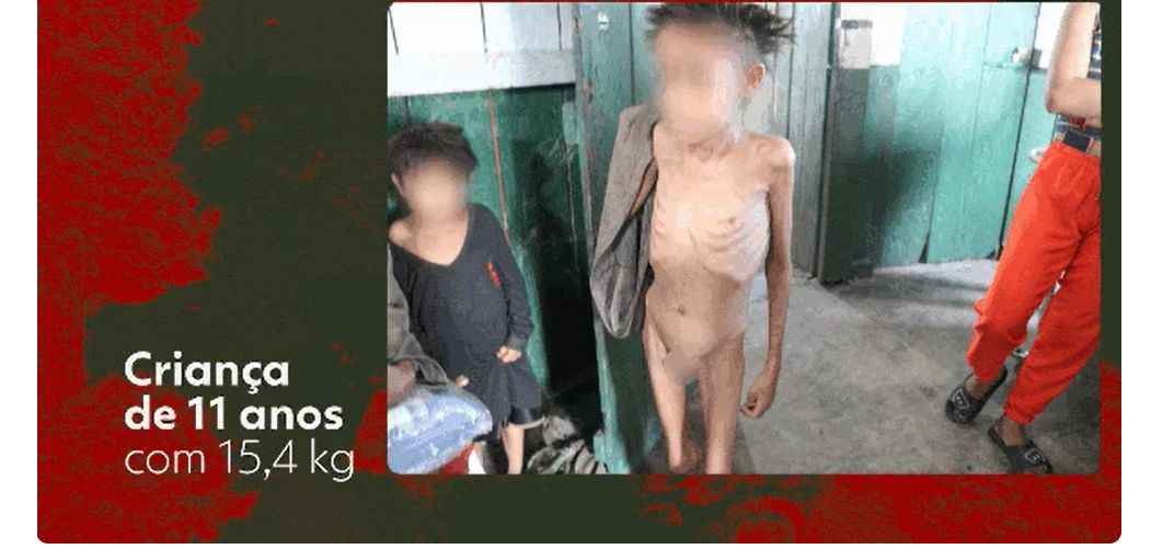 Hoje, porém, o cenário ainda é devastador. Uma das fotos exclusivas obtidas pelo g1 tiradas dias atrás mostra uma criança de 1 ano e 9 meses com 5,3 kg, que é o peso de um bebê de três meses, segundo a Organização Mundial de Saúde (OMS). Outra traz uma criança de 4 anos com 6,7 kg, o mesmo peso de um bebê de cinco meses. Numa terceira, um menino franzino de 11 anos tem apenas 15,4 kg, pouco mais do que deveria pesar uma criança de 2 anos.