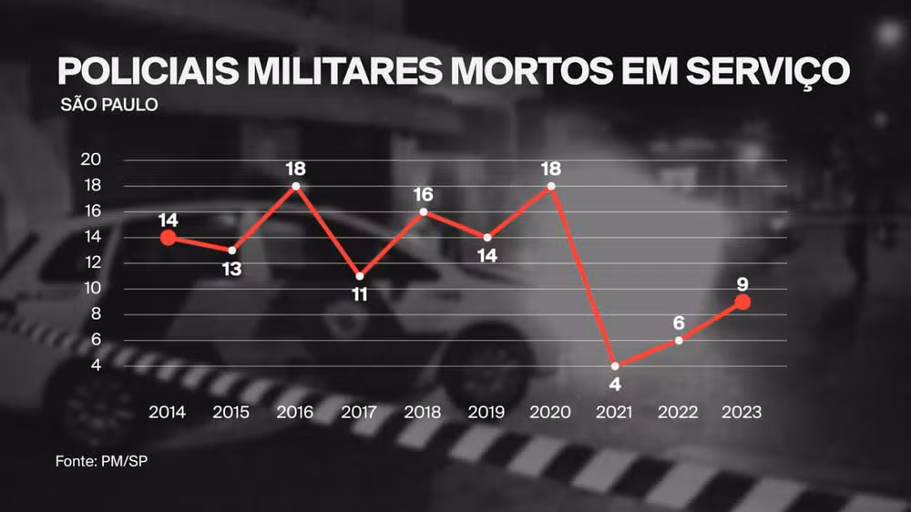 Entre 2021 e 2023, três primeiros anos posteriores à implementação do 'Programa Olho Vivo' - do governo de SP - 19 policiais militares morreram em serviço, o que representa uma média de 6,3 mortes ao ano.