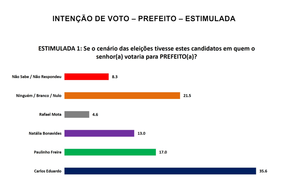 A PESQUISA SETA/ BG/ NATAL avaliou o cenário estimulado para a Prefeitura de Natal. Carlos Eduardo somou 35,6% das intenções de voto, Paulinho Freire assumiu o segundo lugar com 17%, Natalia Bonavides ficou com 13%, seguida por Rafael Motta com 4,6%. Ainda 21,5% votariam branco ou nulo e 8,3% não sabem.
