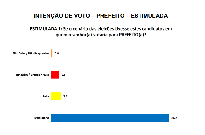 Na estimulada, agora apresentando os candidatos aos entrevistados, a diferença se mantém em patamar semelhante - o prefeito Ivanildinho tem 86,2% contra 7,2% de Leila. Ninguém, branco e nulo somam 5,8% e não sabe ou não respondeu 0,8%.