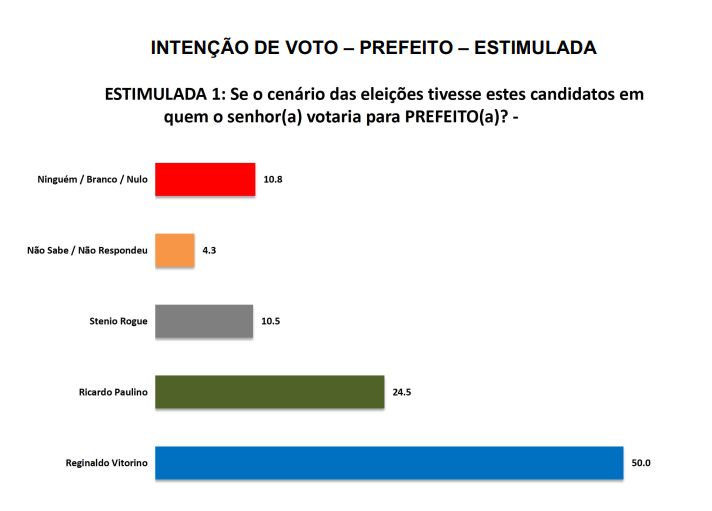 No cenário estimulado para prefeito, Reginaldo Vitorino tem 50%, Ricardo Paulino 24,5% e Stenio Roque 10,5%. Ninguém, branco ou nulo somaram 10,8% e não quiseram ou não souberam responder 4,3%.