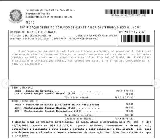 Do Canal SPN - Corre na justiça uma cobrança MILIONÁRIA contra a prefeitura de Natal, o ministério do trabalho e previdência social, ajuizou ação de cobrança contra o município na gestão de Álvaro Dias, por descontar na folha dos funcionários as contribuições sociais e trabalhistas dos empregados, e não repassar aos órgãos federais, o débito e multa ultrapassam os 5 milhões de reais, essa atitude da gestão de descontar do trabalhador e não repassar, está elencado no rol dos crimes de apropriação indébita, a coisa é séria e houve movimentos recente na justiça sobre esse problema.
