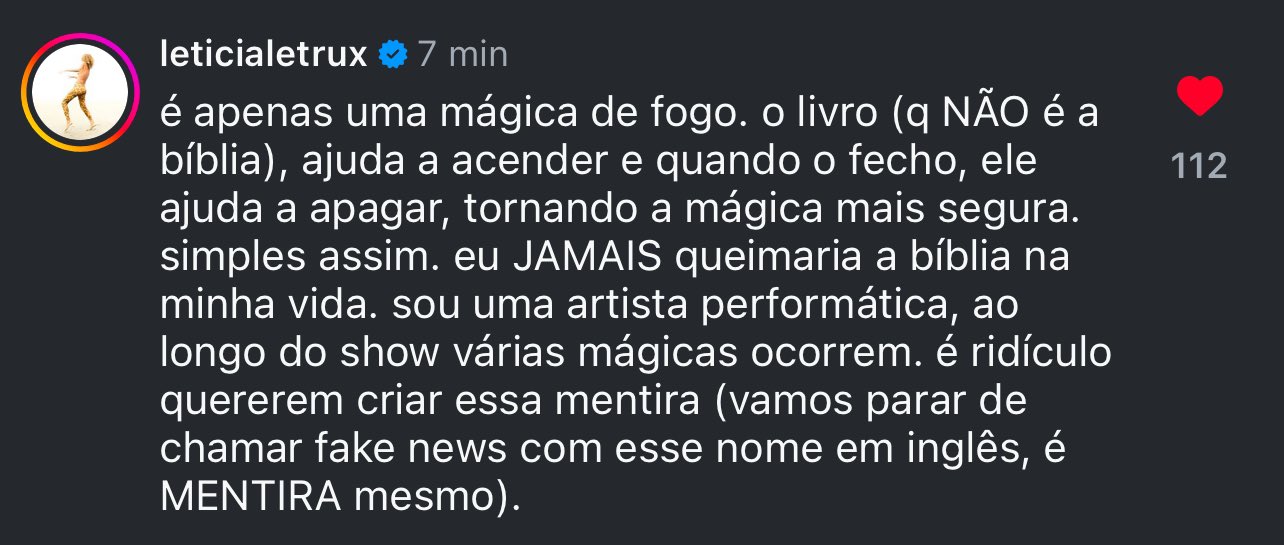 A cantora Letícia Letrux, já premiada por melhor disco solo pela Multishow (aqui), não queimou uma bíblia como uma das atrações do festival cultural, ao contrário do que a indústria das fake news do RN vem espalhando.