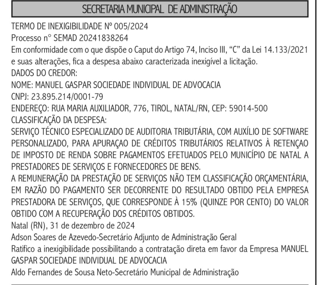 Conforme publicado ontem (02) pelo O Potiguar, o diário oficial do município de Natal de 02 de Janeiro trouxe a contratação pela Prefeitura do Natal de um escritório de advocacia com dispensa de licitação e sem valor estabelecido. A explicação genérica é que o escritório fará uma auditória e ganhará 15% de tudo que conseguir reverter em favor da prefeitura.