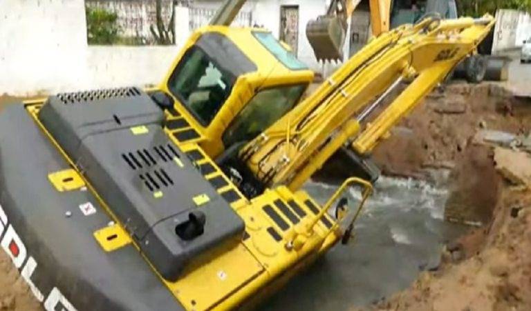 Uma máquina retroescavadeira caiu na obra da Rua Nossa Senhora do Ó, no bairro de Igapó, Zona Norte de Natal. Chove intensamente desde a madrugada desta segunda-feira (13) na capital. E com as chuvas, a máquina afundou dentro da obra.