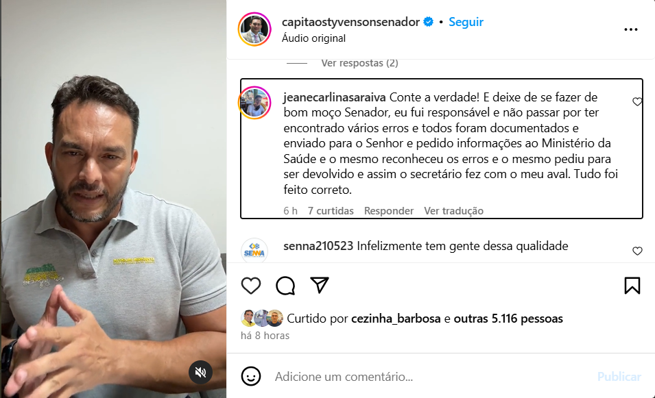 A ex-prefeita de Alexandria até 2024 Jeane Saraiva o interpelou nos comentários. Ela disse: "Foi devolvido por recomendações do proprio Ministerio da Saúde e o Senador sabe bem por quais motivos!"