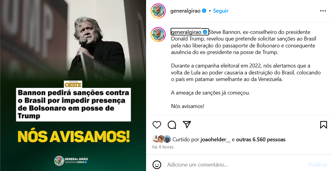 O legal é que não há nem preocupação com disfarce. Em seu instagram, o deputado federal General Girão repercute fala de condenado por fraude, o nazista Steve Bannon, em busca de sanções contra o Brasil.