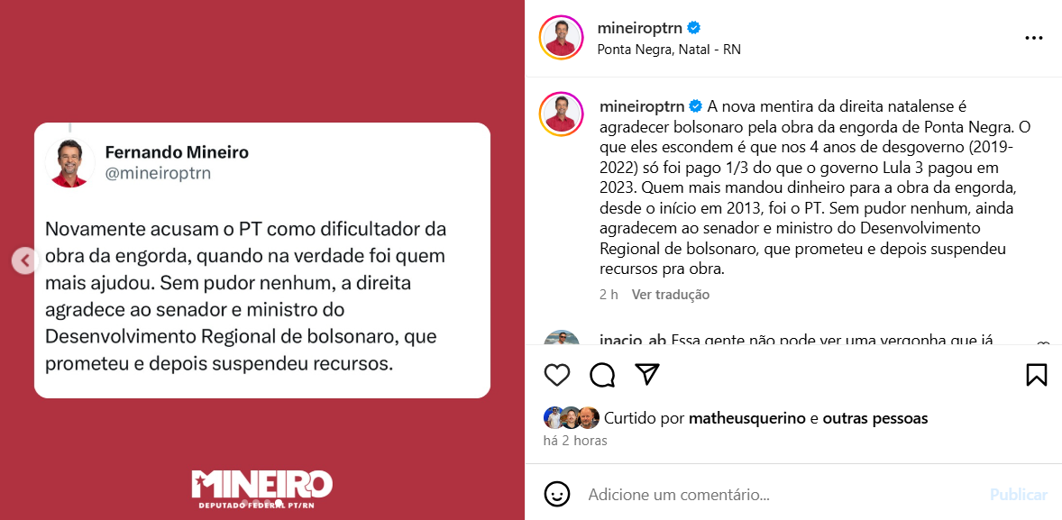 Deputado Fernando Mineiro critica extrema direita de Natal por fake news: "Quem mais mandou dinheiro para a obra da engorda de Ponta Negra foi o PT"