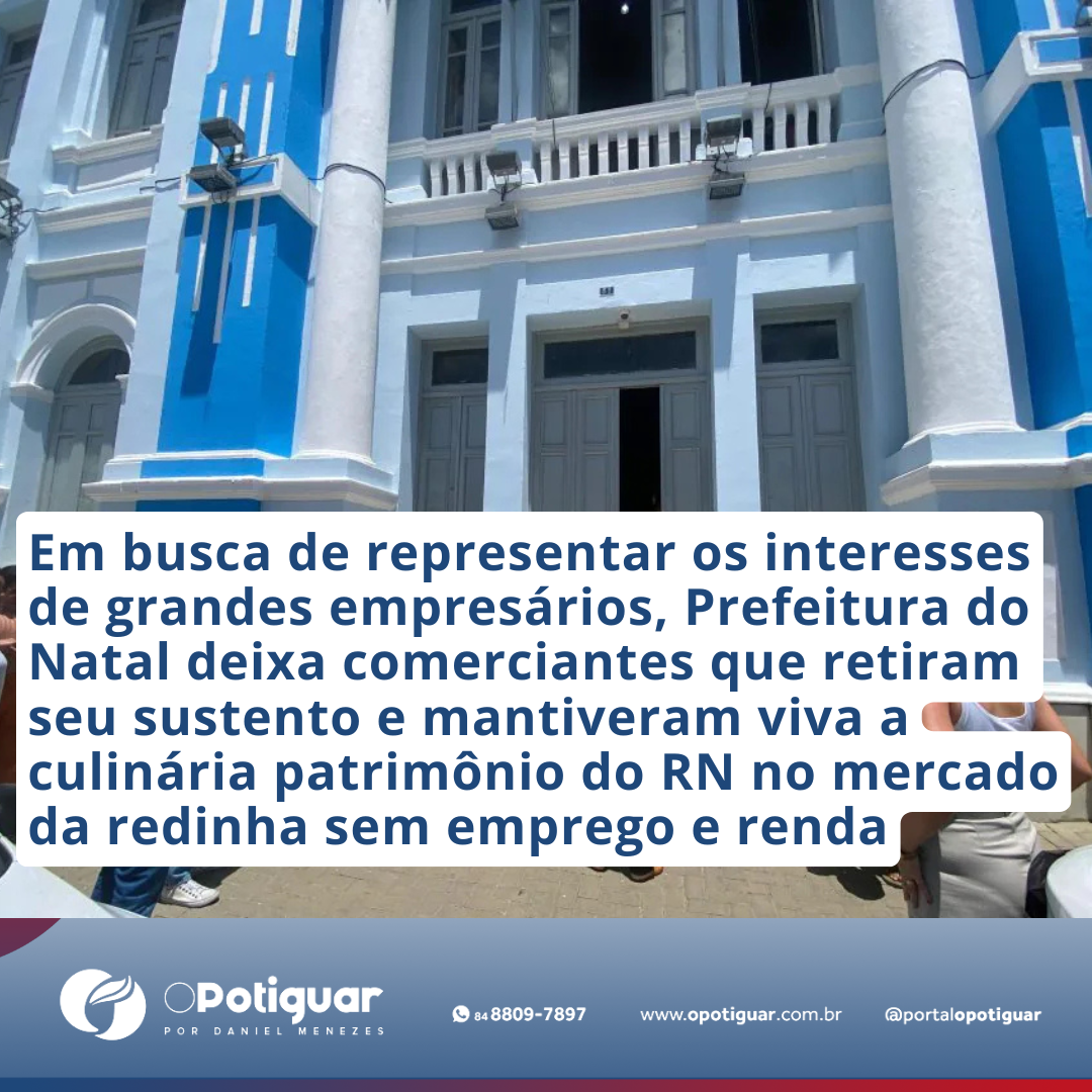 Do blog: a Prefeitura do Natal só está se preocupando com quem tem dinheiro para arrendar o mercado, através de parceria. E, para isso, não pensou duas vezes em rifar o comerciante histórico que tira seu sustento do equipamento e sempre mantive vive a cultura da ginga com tapioca, um patrimônio cultural do RN. Isto na alta estação, momento para eles mais importante do ano. Os comerciantes fizeram protesto hoje na porta da Prefeitura.
